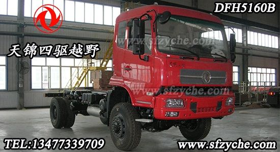 DFH5160B東風天錦四驅越野沙漠車,天錦D530平頭一排半低頂駕駛室,康明斯ISB210 40正宗國四210馬力發動機,立式、直列、水冷、四沖程、空空中冷、直噴柴油機,軸距4200mm,帶電加熱冷起動裝置,全鋼160L燃油箱,有三合一燃油箱鎖,電子油門踏板,消聲器排氣口向外(側吹),Φ350mm推式膜片彈簧離合器,8檔變速箱,變速箱速比Ⅰ8.12 Ⅱ6.08 Ⅲ4.47 Ⅳ3.31 Ⅴ2.46 Ⅵ1.84 Ⅶ1.35 Ⅷ1.00 RL8.12 RH2.46,分動箱高低檔帶差速鎖 、氣動式換檔操縱,4.5噸前橋鑄造橋殼,驅動轉向橋,輪間差速器鎖,10噸雙后橋輪邊減速,鑄造橋殼,輪間差速器鎖,主減速比5.921,帶ABS。