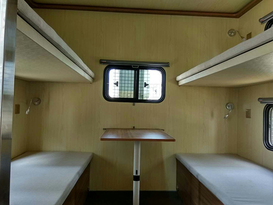 3、休息區(qū)備有4個上下鋪,配有床墊,每個上下床鋪依靠的墻壁上都有一個風(fēng)景透氣窗。每個床鋪下面設(shè)一組附件柜,床位兩側(cè)上方各配衣帽鉤、插座和可調(diào)節(jié)床頭燈,休息區(qū)配有19寸液晶電視一臺及空調(diào)一部。