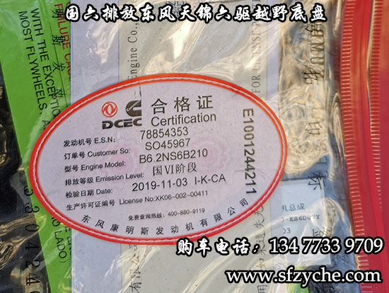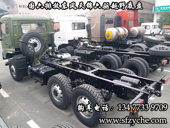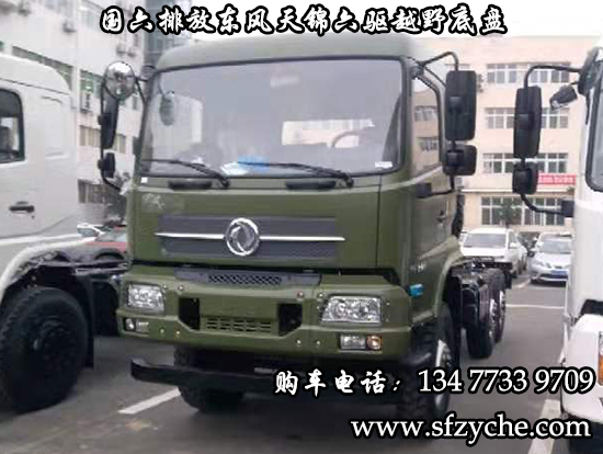 國六排放東風天錦六驅越野底盤,東風天錦D530一排半駕駛室,6×6驅動,康明斯B6.2NS6B210國六發動機210馬力,最大扭矩:850N.m/1100-1700rpm,排量6.2L、韶齒手動六檔變速箱,東風德納車橋,前驅動橋4.5噸,中后橋都為軍工德納4.5噸驅動橋,大花紋越野輪胎,軸距3500+1250mm,電動玻璃,方向助力,斷氣剎,ABS,大燈自動調節,自動調整臂,選裝原廠空調。