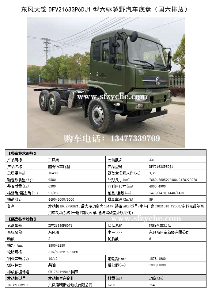 東風天錦DFV2163GP6DJ1型六驅越野汽車底盤參數,國六排放六驅天錦系列公告在第331批《道路機動車輛生產企業及產品公告》新產品公示中已公示,公示完成即可正常上戶。