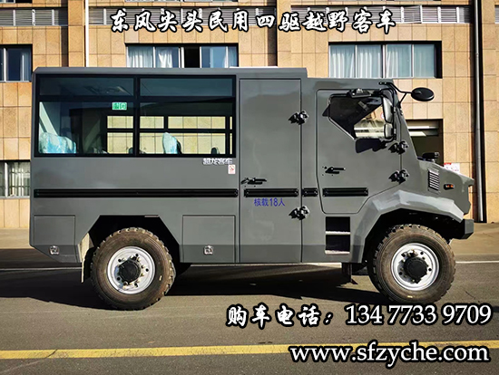 東風尖頭四驅民用越野客車,東風尖頭礦用四驅救援車:采用東風特汽四驅原廠越野底盤,康機220馬力國六排放,自動擋變速箱,前后大江車前輪邊減速帶差速鎖,半自動中央充放氣系統,株齒鋁殼分動箱,全新的猛士三代尖頭設計,整車越野能力強,核定載客可以達到19人,頂置空調,獨立燃油暖風更是標配。