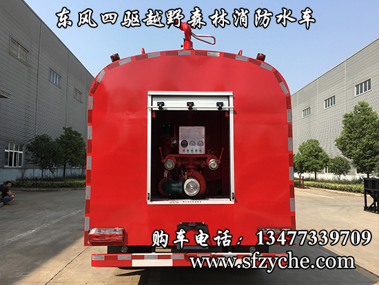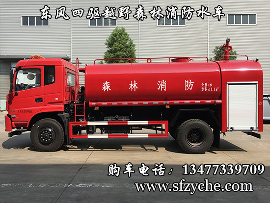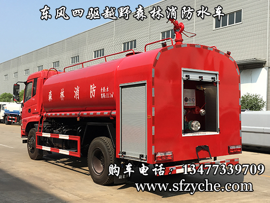東風新款四驅越野森林消防灑水車_東風11.1噸四驅消防水車_國五四驅越野森林滅火水車_東風4×4越野SCS5183GPSEQ型四驅綠化噴灑車簡介:采用東風EQ2180GD5DJ型越野汽車底盤,東風D913新款駕駛室,4×4驅動,康明斯ISB190 50國五發動機,六檔變速箱,東風商用車橋,前驅動橋3.8噸,后橋10噸,10.00R20輪胎,軸距4500mm,電動玻璃,方向助力,斷氣剎,ABS。罐體采用優質碳鋼Q235板材,板材厚度4mm,罐體容積11.1立方,安裝夾心取力器,后置泵箱,消防栓接口左右各一個,消防炮采用PS30-50D消防水炮,流量40L/S/1.0MPa 水射程:≥50m,消防泵采用常壓消防泵型號:CB10/40車用消防泵,流量:40L/s,壓力:1.0MPa,帶前沖,駕駛室頂部安裝長條警燈帶喊話器,全車顏色橘紅,兩側噴涂白色森林消防字樣。