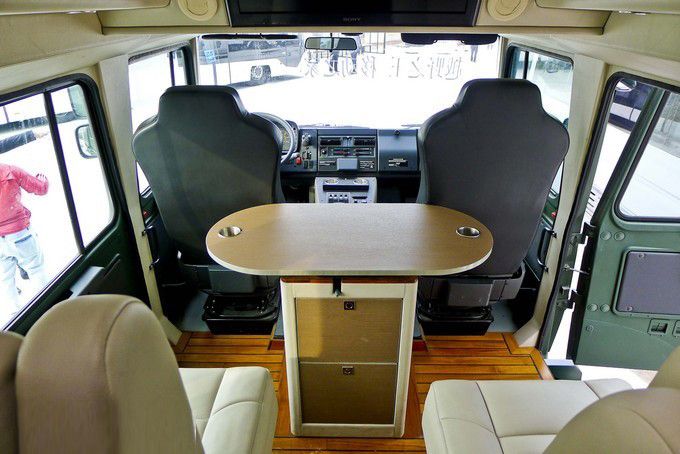 越野房車內飾:可以看到,柚木地板外加兩個電動座椅與一個帶儲藏柜的可移動多功能桌構成了這輛越野房車的第二排。除此之外,頭頂上方安置有26寸索尼液晶電視和帶衛星電視機頂盒的藍光播放器,微波爐烤箱、小型冰箱、電磁爐等常用設備也是一應俱全,當然恒溫式的出水系統以及真空馬桶、獨立淋浴也是一樣不少。具備天窗和側窗的尾箱處安置有兩張舒適的標準床鋪,可以說盡管這輛U5000并非加長特裝版,但所有居住設備都很齊全。