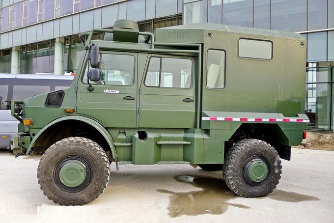 底盤介紹:烏尼莫克U5000擁有兩種軸距分別為3250mm和3850mm,6m的車身長度配合將近2.5m的寬度讓車內的空間利用率發揮到了極致。車頭部分的高度已經將近3m,如果加上后加裝的車廂,各位可以想象遇到較低的限高時是多么尷尬。門式車橋在此無需多言,接近500mm的離地間隙,再加上1.2m的涉水深度足以面對所有極限路況,此外選裝軍版套件的涉水深度可以達到1.5m。其零部件及電氣元件有防水保護、再配合防水式前大燈,輪轂、制動器密封等讓這輛猛獸無所不能。除了基本的車身防護裝備,“鵝頸式”縱梁的布置,使梯形車架與兩個相對的縱梁構成一個U字型,并焊接在管狀縱梁上,可允許橫縱梁產生較大的扭轉度,通過橫向推桿與螺旋彈簧間的聯動,能實現高達30度的車橋對角扭曲。而三點式懸掛也是烏尼莫克實現極端越野的關鍵之一,當車輛需要對角行駛以越過高差超過0.5米的障礙物時,三點式懸掛可以保證車輛形成大角度移動和扭轉。相對于粗狂的外形,烏尼莫克式的內飾也顯得相當質樸,在提倡減少控制面板按鈕的時代,U5000也有著自己的詮釋,那就是將所有舒適裝備盡可能的簡單化,最大化的給輔助駕控的功能按鈕預留空間。UG 100-8型變速器具備8前進擋、6倒擋帶手自一體功能,其前進擋速比為9.57-0.73,倒擋速比為14.56-1.12。兩級常開閥發動機制動在這種允許載重超過12500kg的龐然大物上相當實用。看到這樣的空調面板,你是否會感覺自己回到了90年代,具備三把鎖的U5000,再配合4.8L直列四缸渦輪增壓中冷直噴柴油發動機所迸發出的160kW/2200rpm功率、810Nm/1600rpm扭矩的強大動力數據,足以保證其優異的越野性能,當然你還可以再選裝中央輪胎自動充放氣系統。