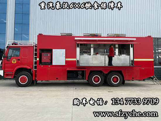 重汽豪沃6×6消防飲食保障車是根據公安,武警,消防,林業局,地質勘探,水利水電,公路搶險等部門野外執行任務的需要,為提高后勤保障能力,改善野外生存條件而研制的一種新型野外自行式炊事車,特別適應快速反應部隊執行任務的需要。該車采用重汽豪沃六驅底盤,車廂為隔熱保溫大板粘接式輕型結構,多種供電方式為車內各用電設備提供電源。車內配有高效的封閉式燃油節能爐灶、配套設備、各種廚具等。本車具有操作方便、使用可靠、熱效率高,保溫效果好等特點,適應全天候展收作業,是先進的后勤裝備。可在一小時內供應150人的主副食及開水。備注:據用戶需求,整車對底盤進行改裝,設有8-13Kw駐車自發電系統,1.5Kw行車發電系統,以及配電系統,主副食控制系統,作業監控系統,水路系統,油路系統, 附件及工具。