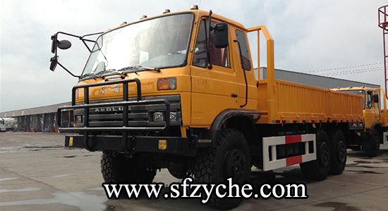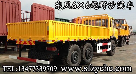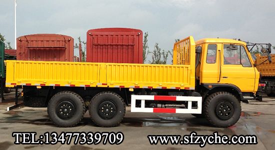 2、詳細配置:平頭一排半駕駛室,6*6驅動,康明斯190馬力,韶齒6檔變速箱,斷氣彈簧制動,貫通式中后驅動橋,12.5R20越野胎,軸距 3500+1250mm,加厚雙層大梁,貨箱4850mm,帶軍用保險杠。(新款仿天錦駕駛室加價1.5萬元)東風越野卡車:m.w484.com
