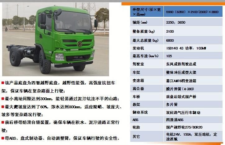 相關(guān)車型EQ2070GZ4DJ越野四驅(qū)底盤的詳細(xì)描述:該產(chǎn)品底盤為四驅(qū)越野底盤,越野性能強(qiáng),高強(qiáng)度抗扭車架,保證車輛在復(fù)雜路面上行駛時,不會出現(xiàn)大梁斷裂等情況;最小離地間隙達(dá)到300mm,能輕易通過泥濘坑洼不平的山路;最大爬坡度達(dá)到了60%,適應(yīng)陡峭、坡度大、坡多等復(fù)雜路況行駛。前后橋帶防滑自鎖裝置,確保車輛在積水、泥濘道路正常行駛;帶ABS、盤式制動器、自動調(diào)整臂,保證車輛行駛的安全性。