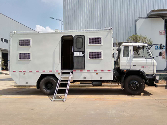 三、東風四驅越野宿營車, 4驅越野宿營車用途:適用公安、特警、公安、邊防、衛生、交通、礦山、地質、軍隊等部門]長期野外作業、勘察、救援、搶險、救災等宿營用,箱體空間利用大化。內部配置:配備前儲物柜、后儲物柜、液晶電視機應急燈、頂燈、頂置空調、床墊、被褥等。選裝配備8組豪華折疊臥鋪、未鋪上下梯、安全保險帶、電源插口等,細節精致。外置燃油加熱器、頂護欄、前爬梯、隱藏抽拉梯、專用房車門、專用玻璃滑窗、警示燈等。